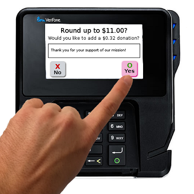 the machine can prompt the customer for a round-up donation, saving the cashier from having to remember. Not only that, but the credit card gets the same percentage of yes responses as if your cashier had asked.